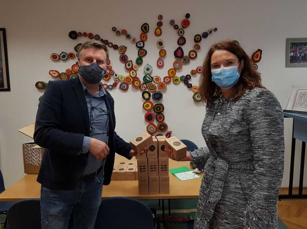 Predsednik Rotary kluba Maribor Lent, Aleksander Jeršič, predal spletne kamere ravnateljici Meliti Bizjak RadeljičV preteklih dneh je Rotary klub Maribor Lent razveselil naše učenke in učence z donacijo dvajsetih spletnih kamer. Z njihovo pomočjo si bomo napravili dolge razdalje med nami pri šolanju na daljavo še bolj kratke.