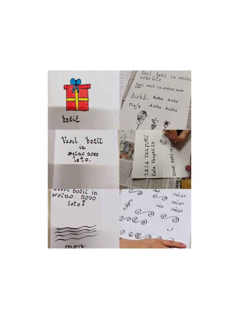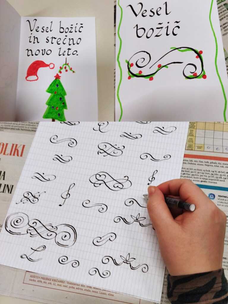 Nadarjene učenke od 5. do 9. razreda so se danes, 8. 12. 2022, udeležile kaligrafske delavnice. Na delavnici so spoznale, kaj je kaligrafija in katere kaligrafske pripomočke poznamo. Spoznale so eno izmed pisav, na koncu pa so izdelale božične voščilnice, pri katerih so uporabile usvojeno znanje. Kako ustvarjalne so bile, si lahko pogledate na fotografijah.