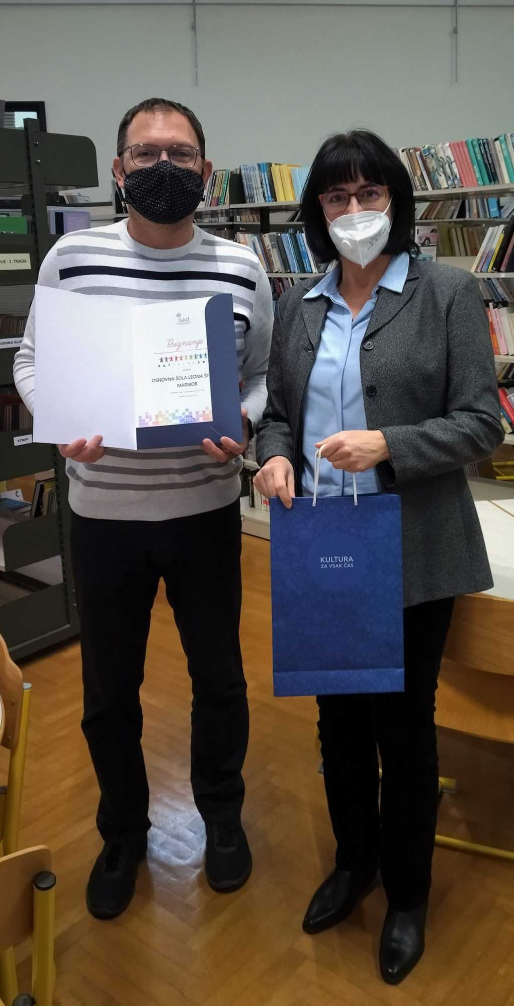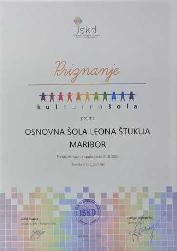 V septembru smo se razveselili naziva KULTURNA ŠOLA, ki smo ga prejeli za delovanje na različnih kulturnih področjih in ga podeljuje Javni sklad kulturnih dejavnosti RS za obdobje naslednjih štirih let. Danes pa sta nas osebno obiskala tudi predstavnika območne enote JSKD Zala Horvatič in vodja enote Matija Varl, ki je priznanje in zastavo KULTURNA ŠOLA izročil naši koordinatorki kulturne šole Danijeli Kajzer. Zastavo in priznanje bomo izobesili na vidno mesto, da nas bosta še naprej motivirala k ustvarjanju na različnih področjih.