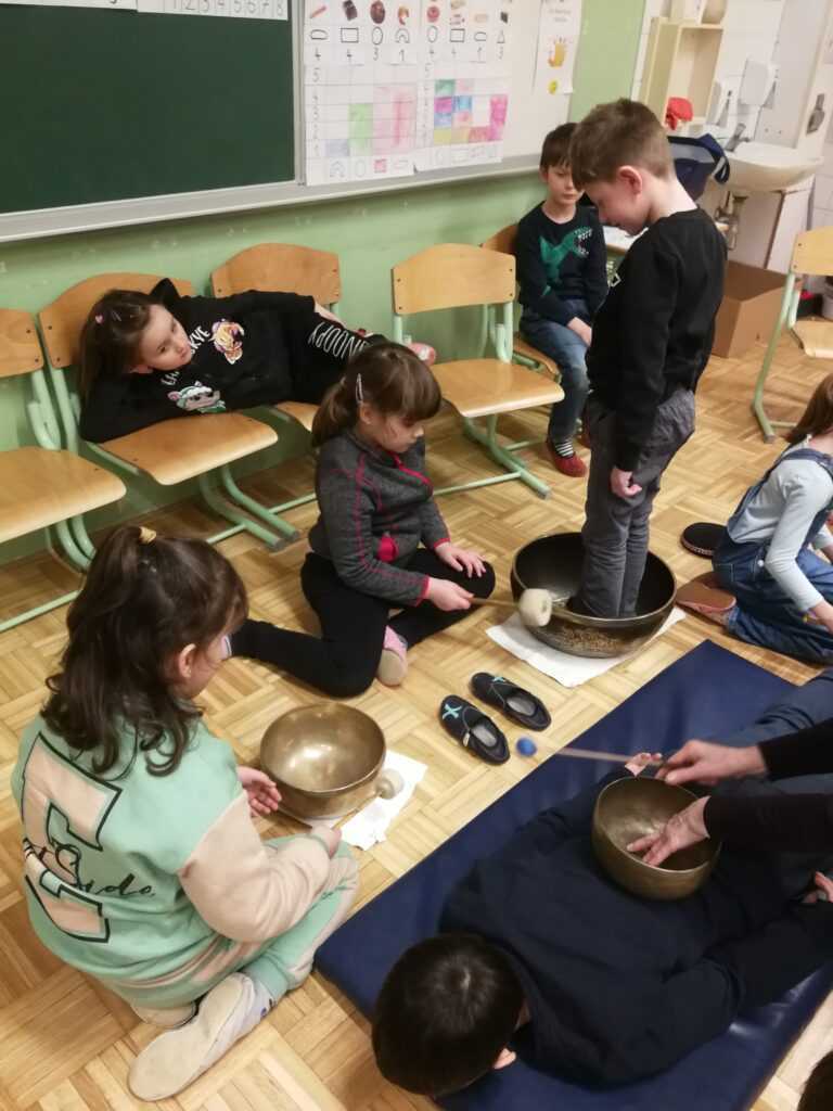 Učenci 1. razredov so se s pomočjo velike školjke in tibetanskih posod prepričali, da lahko zvok tudi občutimo, ne samo slišimo. Vibracije, ki so nastale ob zvoku, so zelo prijetne. Zvok nas je nežno žgečkal in masiral. Otroci so na posode zaigrali, v nekatere pa so smeli tudi stopiti.
